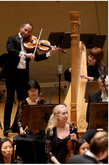 Tamestit seldom stationed himself in the conventional spot beside the conductor. He moved about the stage, from level to level, like the wanderer Harold on mountain pathways. When the finale commenced in a violent eruption, Tamestit’s daunted character shrank from his place by the podium and fled to a safer locale, behind the cellos – then, having no further music to play for quite a stretch, retreated through a rear stage door and out of sight. When the violist returned, it was as part of a delicate episode for string quartet with two members of the first violins and a cellist convened on the second level behind the harp.